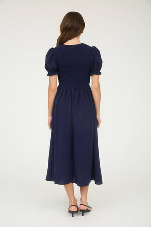 V NECKLINE SHORT SLEEVES MULTIPLE FRONT TIE SMOCKED BODICE A-LINE SOLID LINED MIDI DRESS SHELL:100%POLYESTER LINING:100%POLYESTER