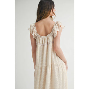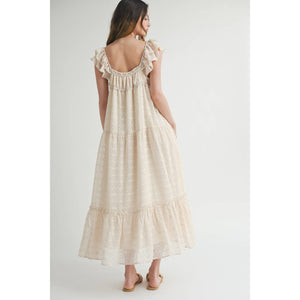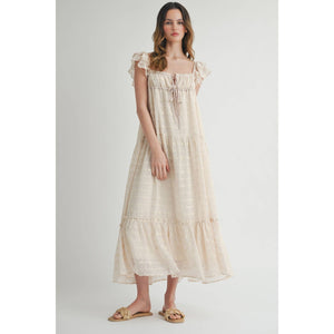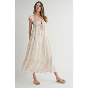 The dress features ruffled cap sleeves and a square neckline, complemented by a delicate tie at the front. Its tiered design adds movement and elegance, making it a versatile option for various occasions, from casual gatherings to more formal outings.