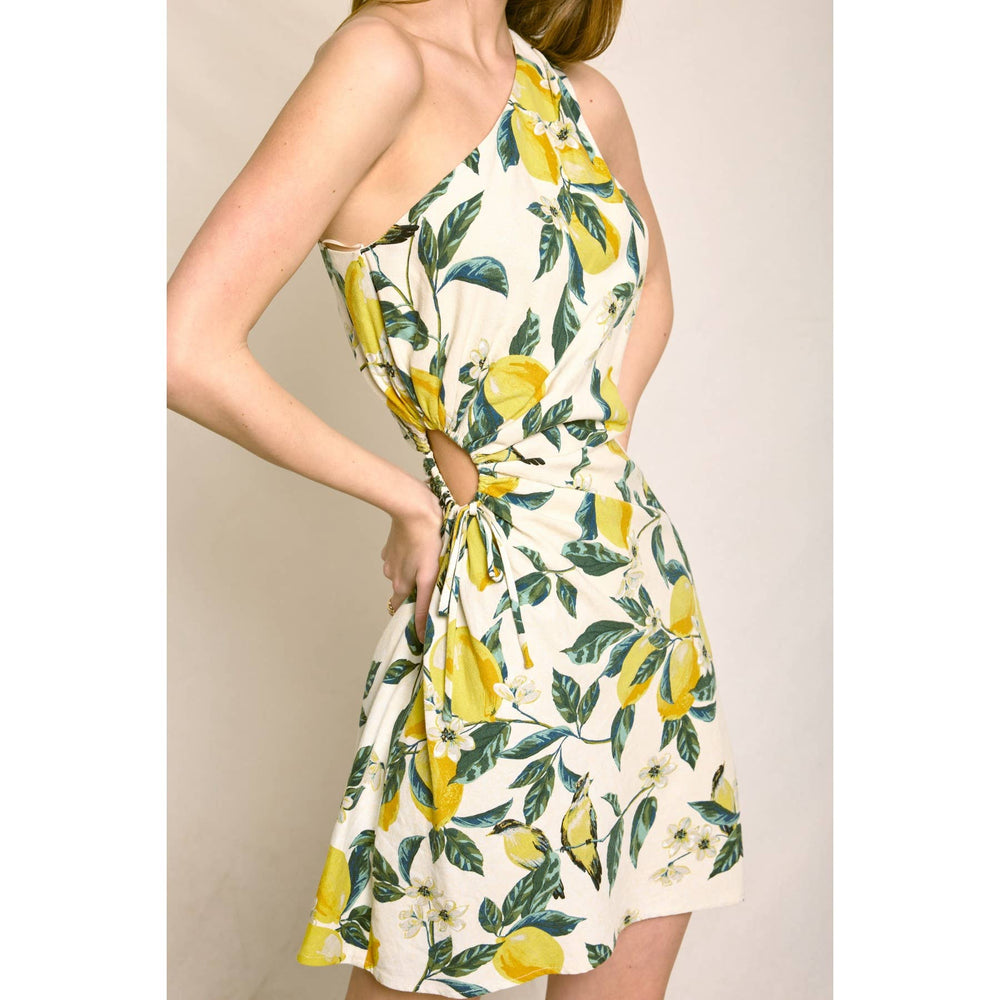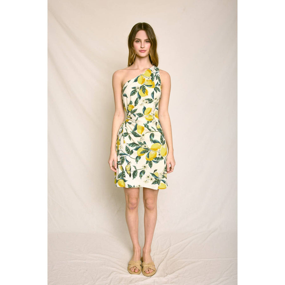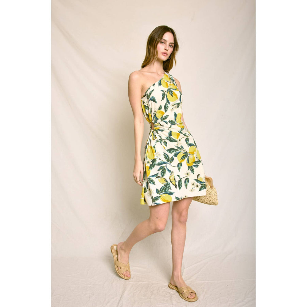 Capture the vibrant spirit of the Amalfi Coast with this Lemon Grove Mini Dress. Featuring a stylish one-shoulder design and delicate ruching, it flatters your silhouette while the tie detail at the waist adds a chic touch. Crafted from breathable cotton-linen blend and fully lined for comfort, this dress offers a hidden side zipper for a sleek fit without elastic or smocking. Perfect for sunny days and warm evenings, it combines effortless elegance with Italian-inspired charm.